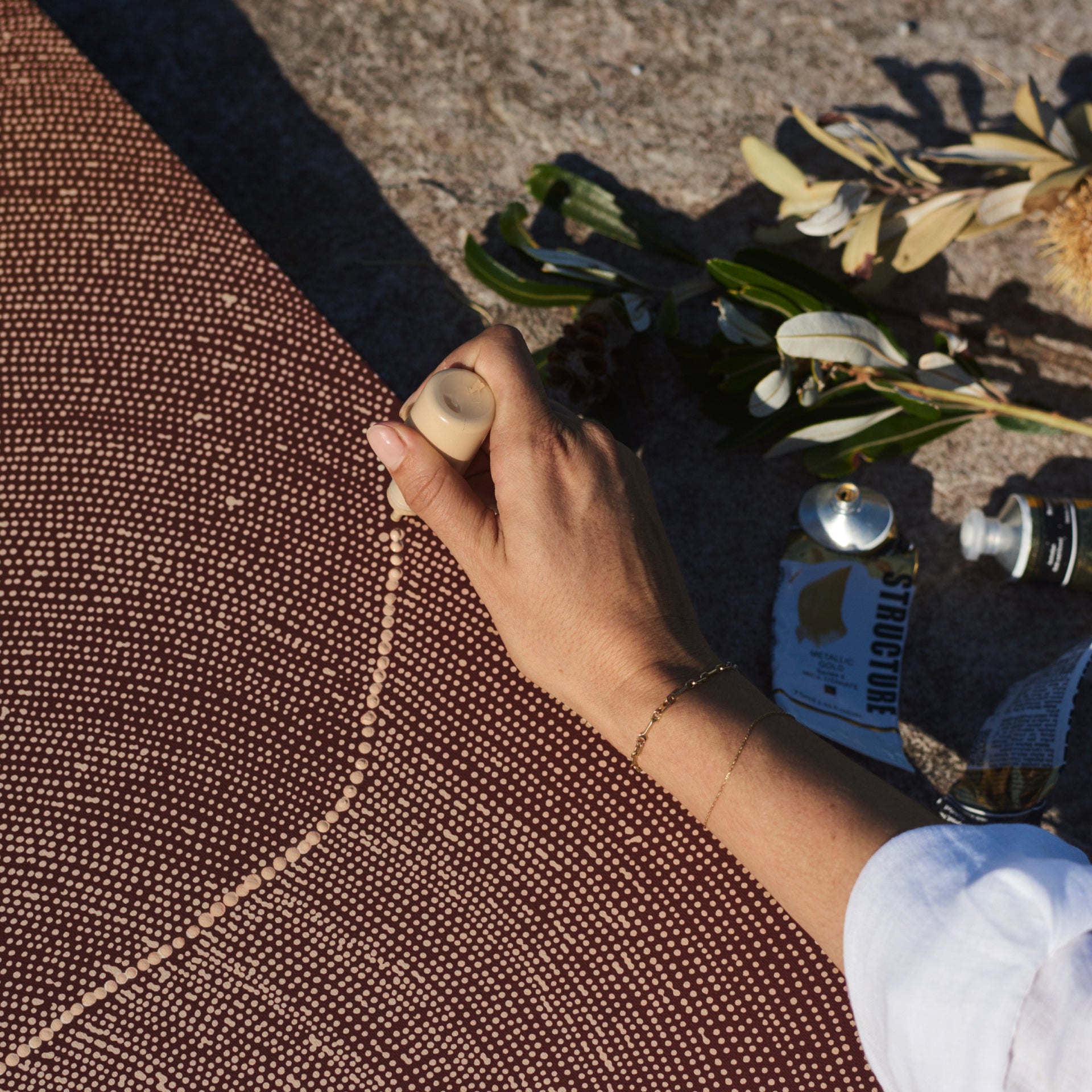コアラの依頼を受けて、ナイアは6つのオリジナルアート作品を描き、地上でもっとも古い文化に新たな生命を吹き込みました。その一つひとつが、彼女が遠い先祖から受け継いだ静かな物語の世界へと見る人を誘います。