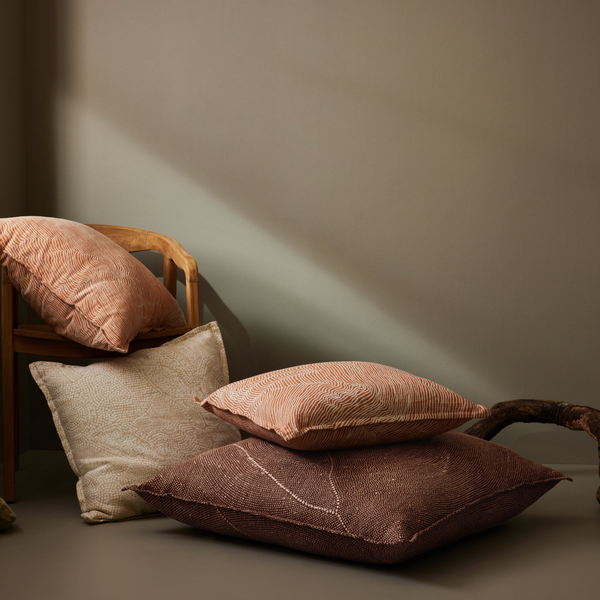 キャンバス作品をスクリーンプリントで精巧に再現し、環境に配慮した方法で調達された最高品質の素材を、インドの熟練の職人が丹念に仕上げました。このホームウェアはすべて、大地にインスピレーションを受け、地球への思いを込めてつくられています。