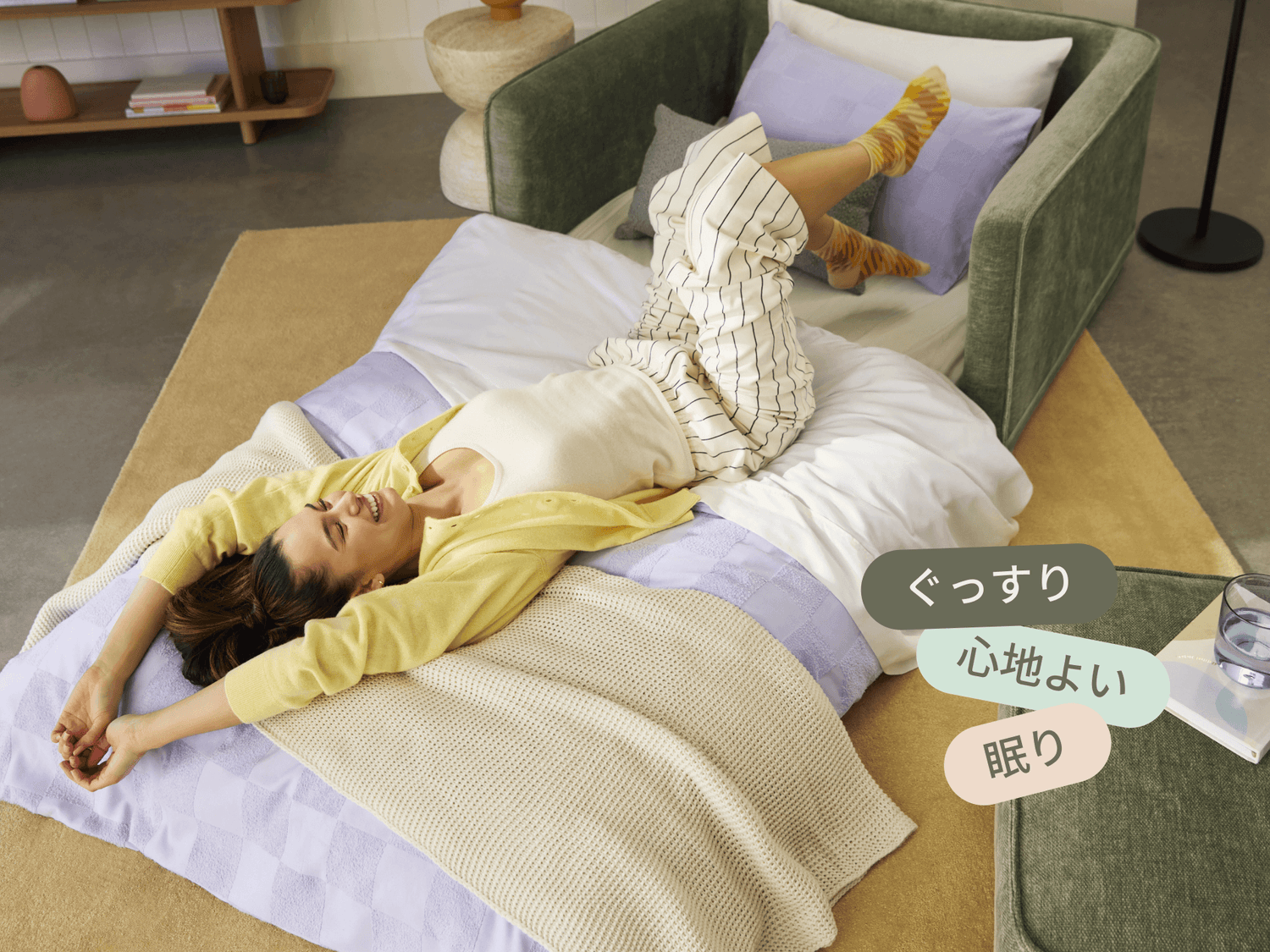 背もたれと座面を倒すだけで、わずか5秒でソファーをベッドにスイッチ。ソファー・カウチソファー・ベッドを自在に切り替え可能。